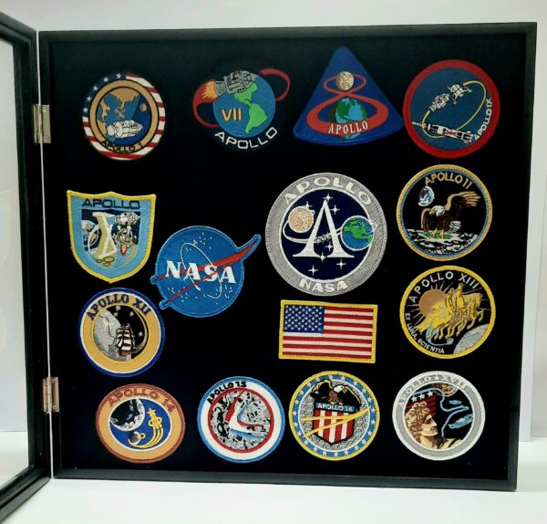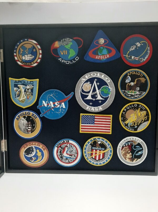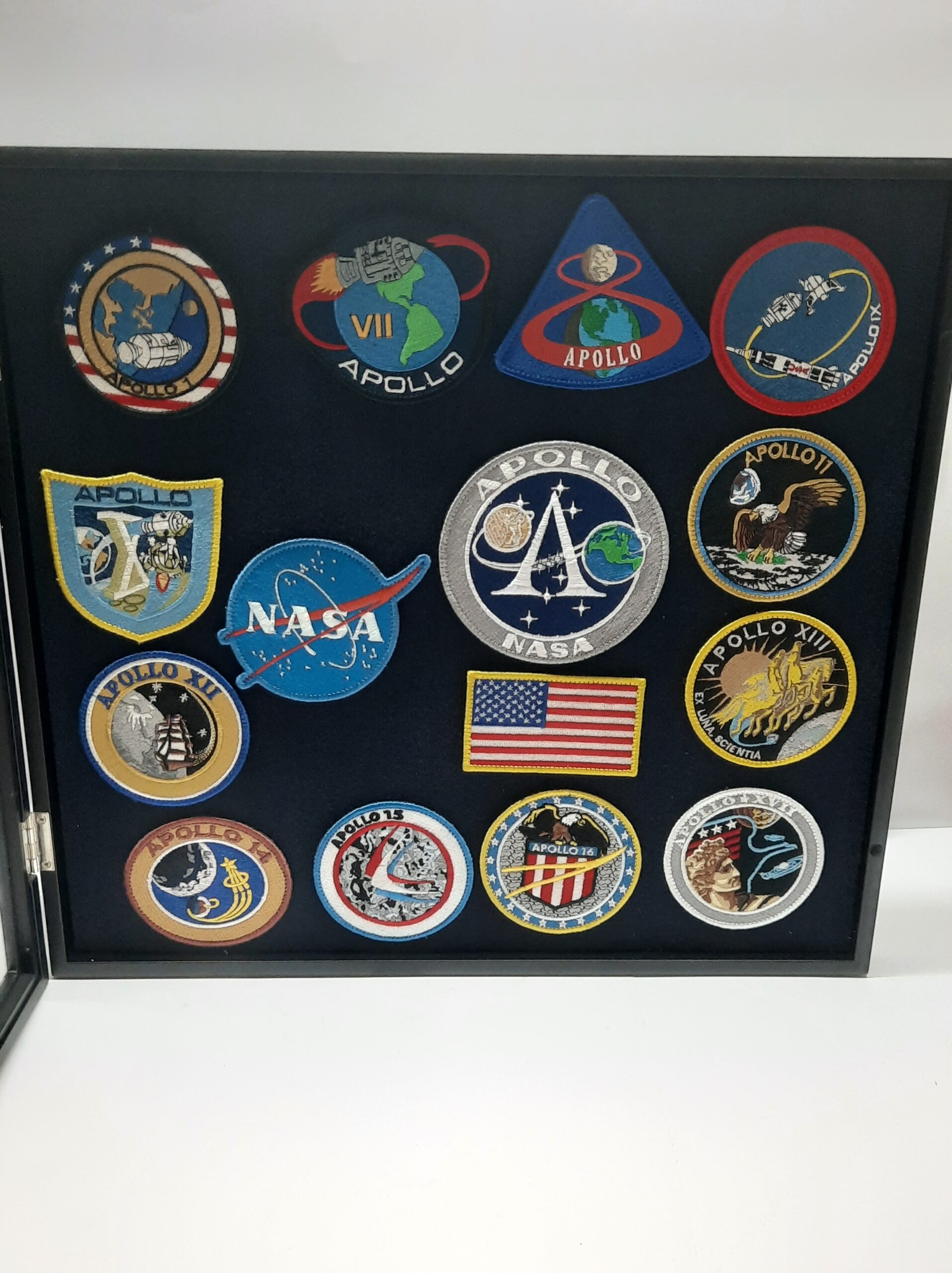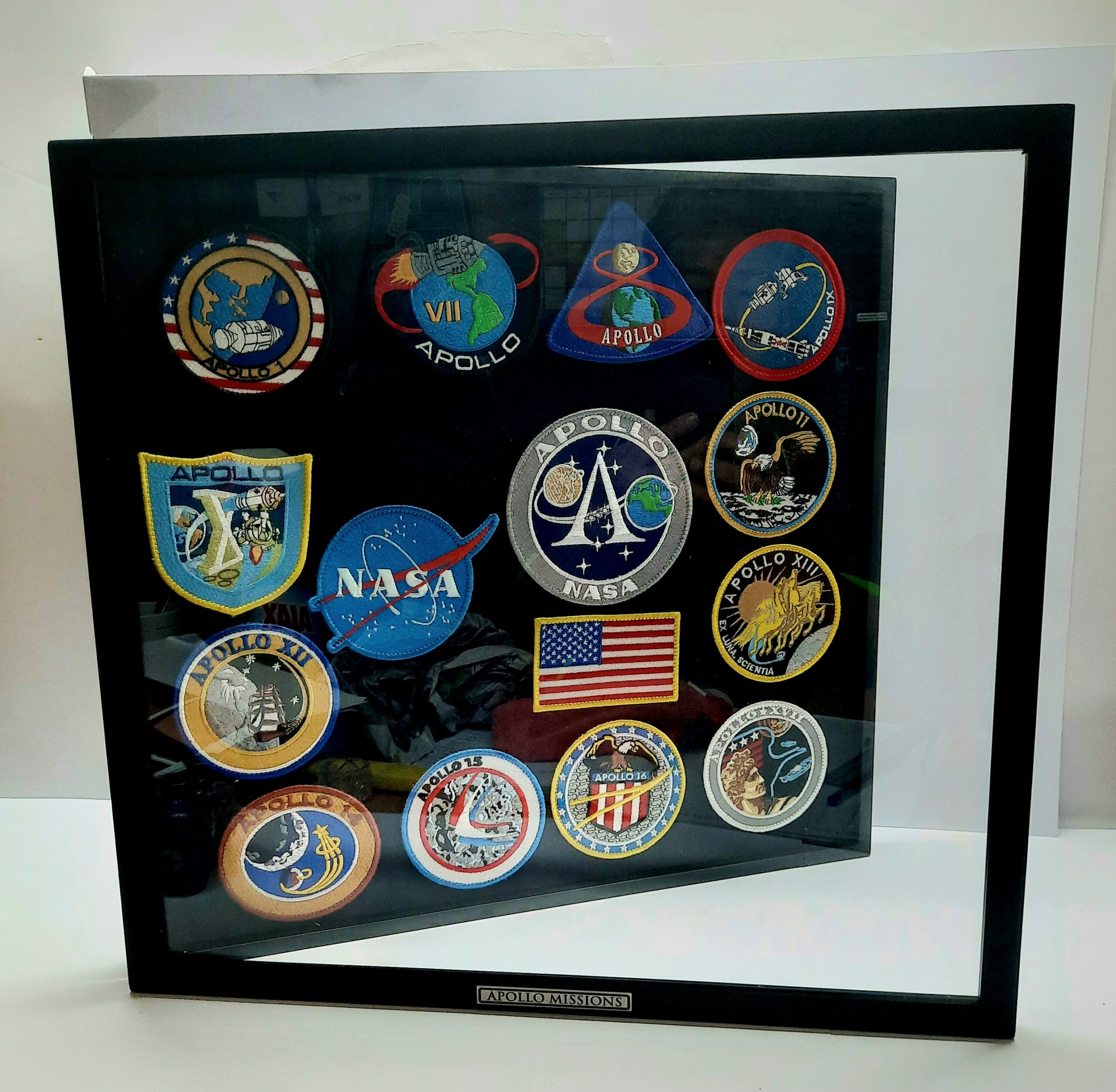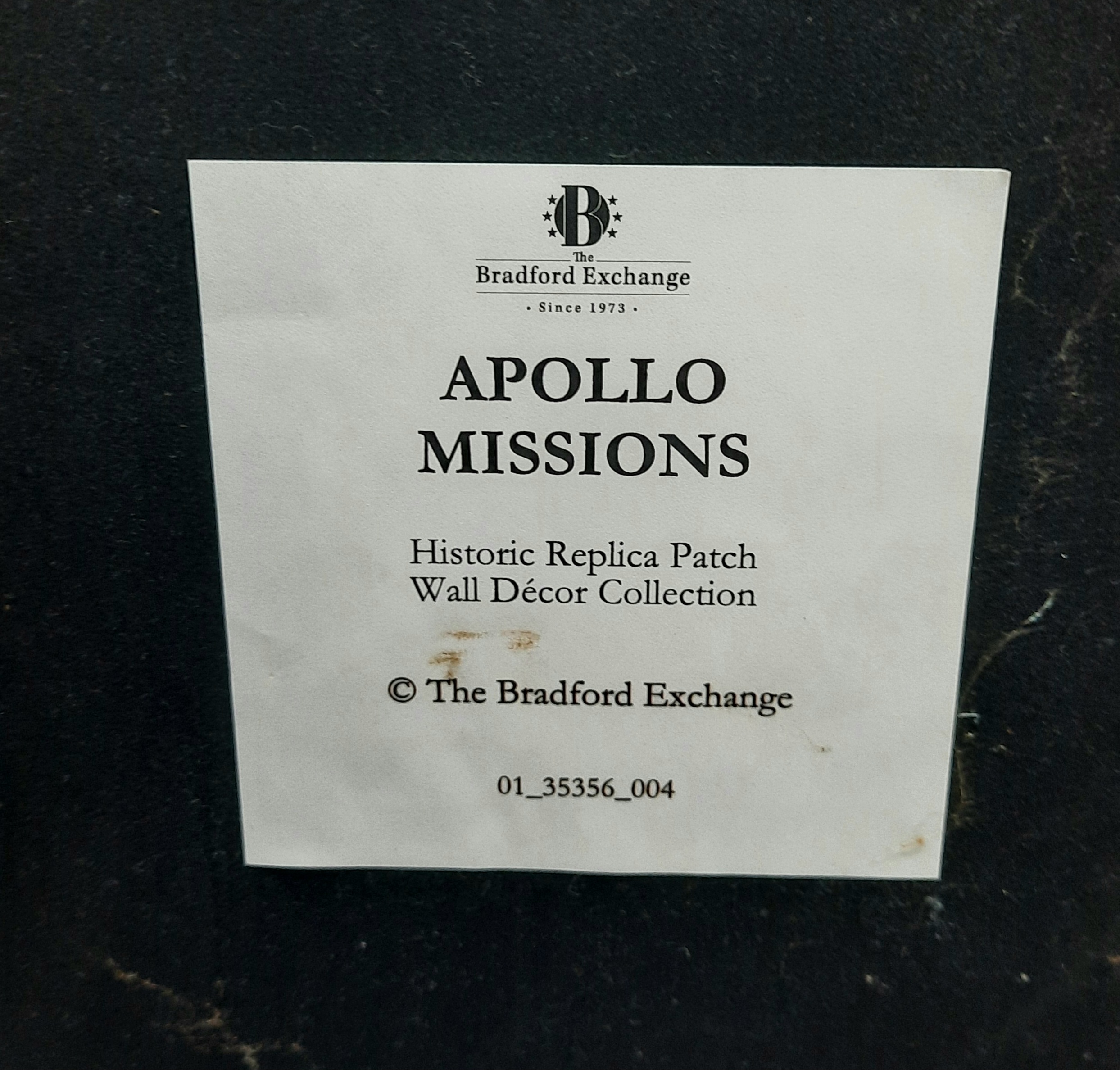 Stunning collection of the Apollo Missions replica NASA woven badges. All badges have velcro backing which can be placed in order of your choice inside the case, black felt to hold in place. Superior quality badges in a beautiful quality frame. A great piece for the budding enthusiasts of NASA or space missions , great conversation piece for the study, office or any other décor. A great gift for someone special. Frame measures 46cmx44cm. Packed with care for shipping. Check our listing for another Bradford Collection of Apollo 13 Mission.