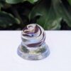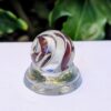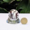 Unique contemporary art glass ribbon marble with clear glass stand. This stunning marble with brown and white ribbon swirl in the centre of the marble which rests on a clear glass stand. Approximately 1" in diameter , $2 coin for sizing preference. A statement piece for the office decor or desk, also makes a great gift for someone special. Origin unknown. Free from any chips or damages. Packed with care for shipping.