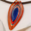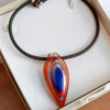 Art deco style Murano Glass pendant in tear drop shape, stunning metallic foil colours from cobalt blue to orange, vintage c1990s, this pendant is complete with deep olive green choker style rubber style material with gold clasps. The pendant measures8cm length & 4cm width. Comes with original giftbox and label.