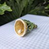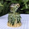 Looking for a novelty bell, well this turtle maybe the item you are looking for. This cute turtle nestled on a tree stump standing on his back legs would make an interesting conversation with friends. Ceramic turtle in deep green colour glaze with hues of brown with red eyes. Complete with white ceramic ball for the bell. Stands 9cm tall, free from any chips or damage. Packed with care for shipping. We welcome multiple purchases and combine shipping for your convenience, drop us an email and we can assist you with your request.