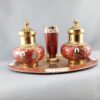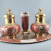 Vintage brass incense holders with vase and matching tray. Brass and rich red enamel finish. The set contains 2 pots suitable for incense cones which have holes in the lids for incense sticks. Great little item for a gift for someone special that loves burning their incense sticks or cones.