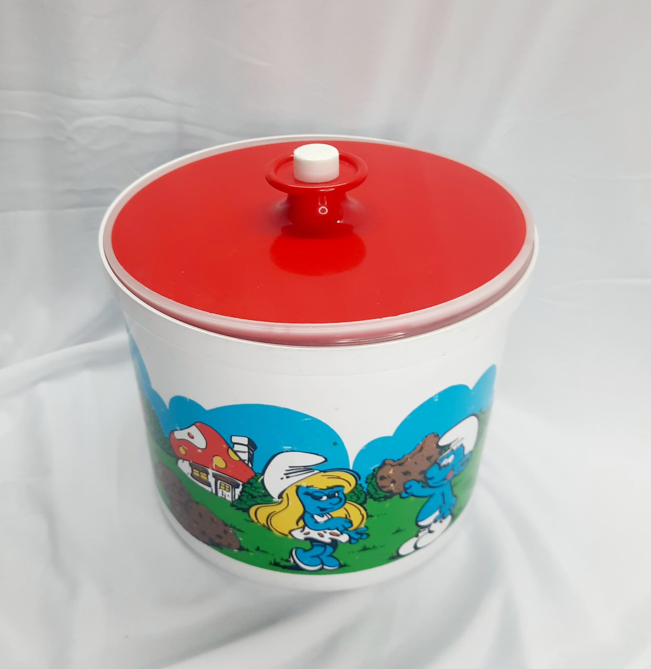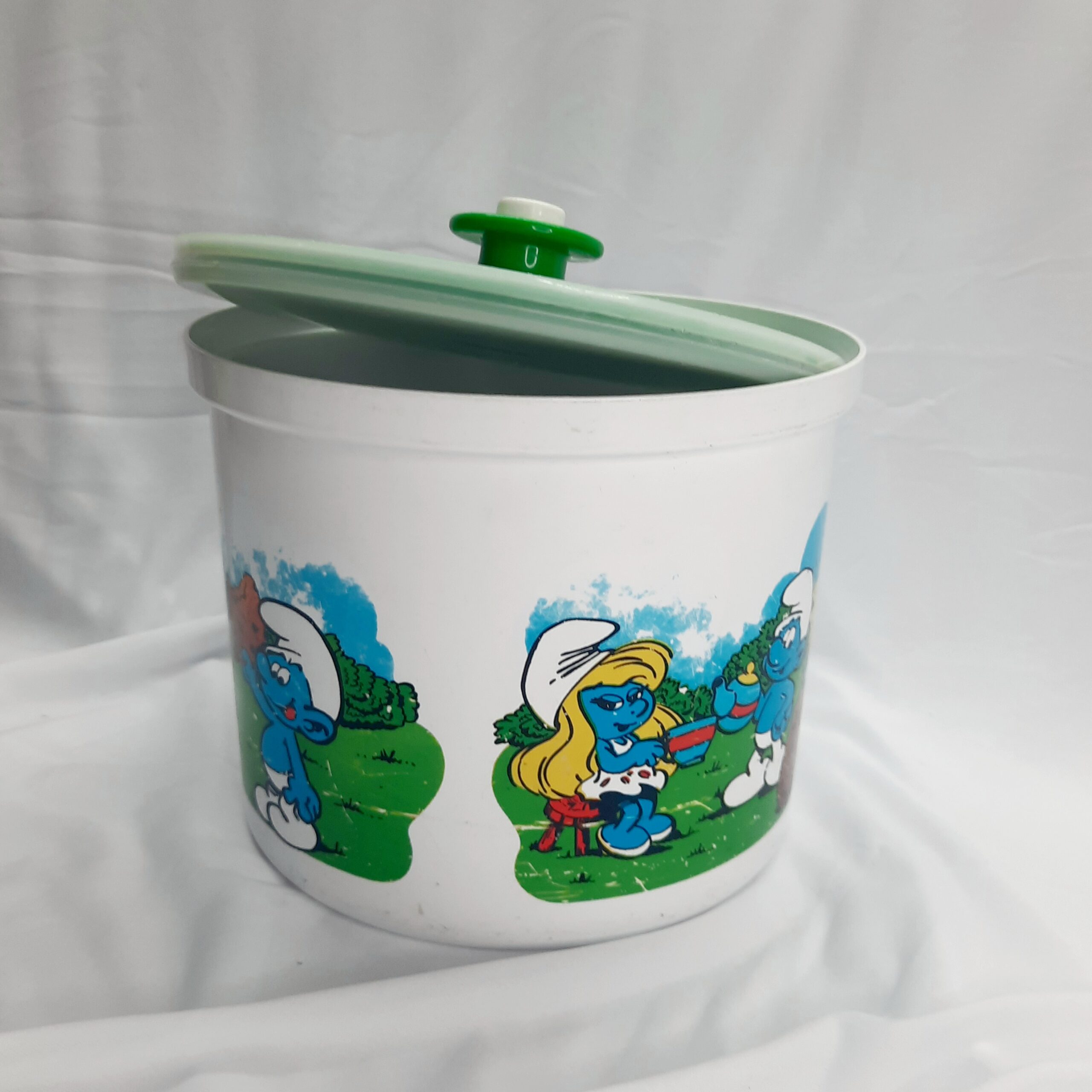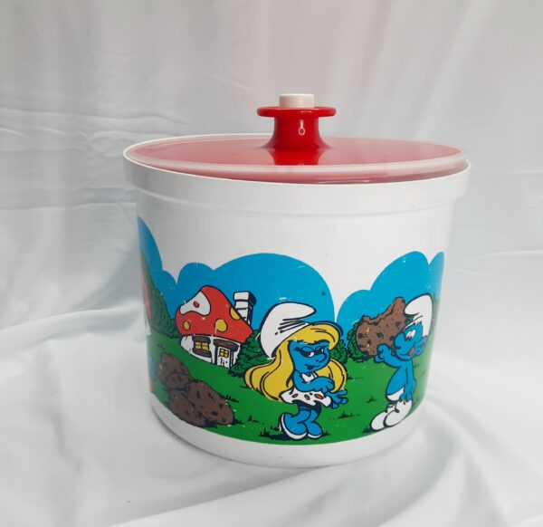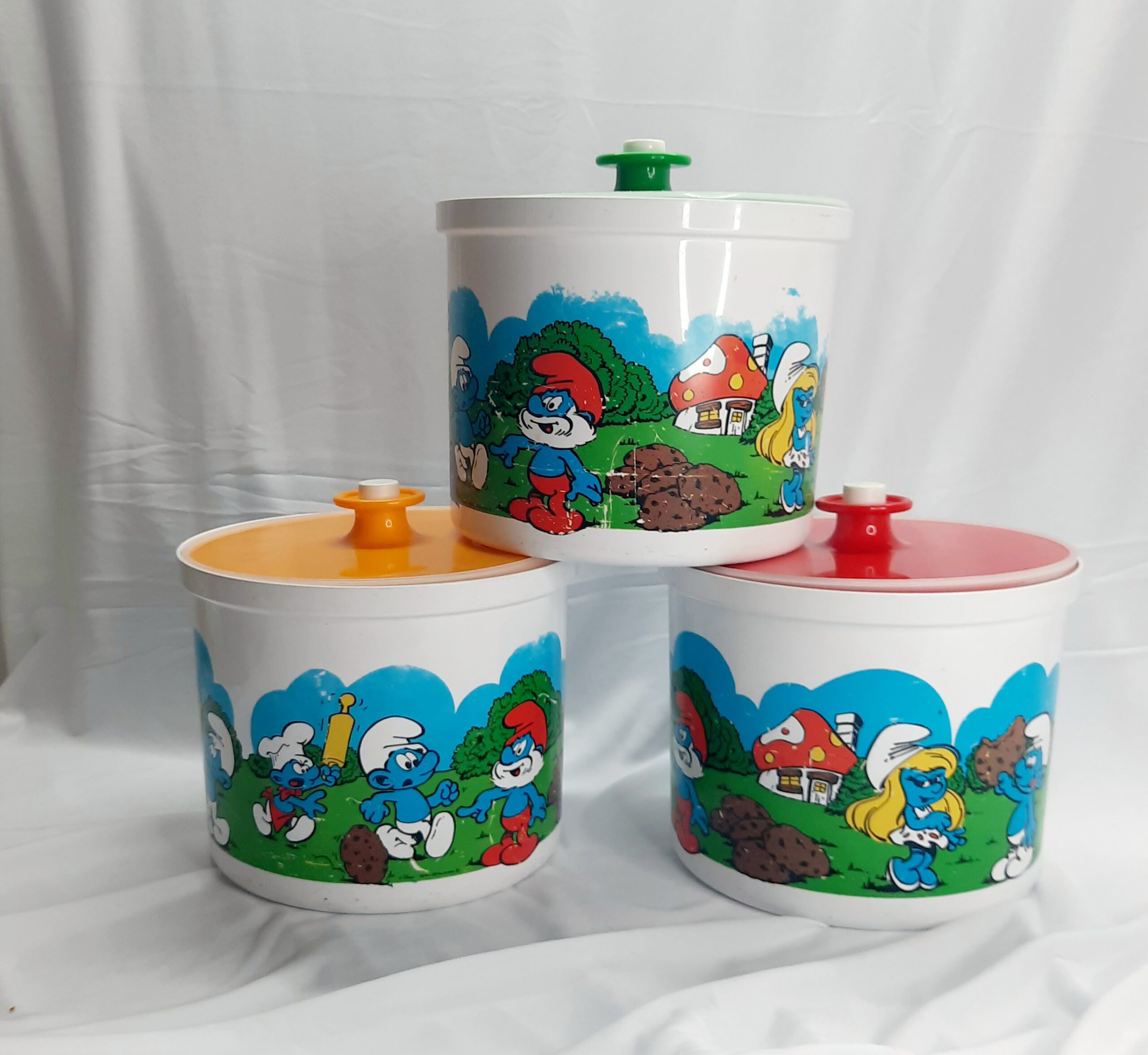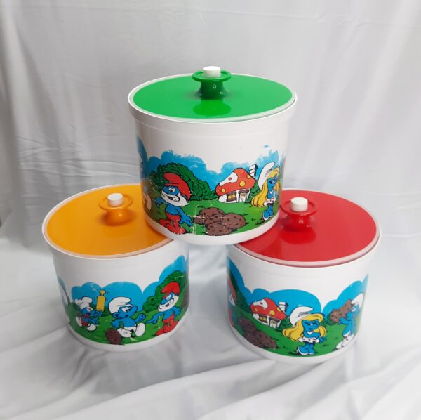 Vintage Decor 1981 Smurf canisters with green, gold-yellow and red lids. What a blast from the past with these awesome Decor canisters with the ever lovable Smurfs in their village. These canisters were released as a joint venture with BP petrol in 1981 and were limited edition. The canisters hold 3 litres or 6.3 pints with a push button sealed lid. A kids classic cartoon that will last for generations for any retro kitchen or decor. Versatile canisters for any purpose or collection. The canisters are free from any damage or cracks, does have signs of wear and tear which is to be expected for 42 years. Decor is Australian made. Make these yours today as they will not be on the shelf for too long. Packed with care for shipping.