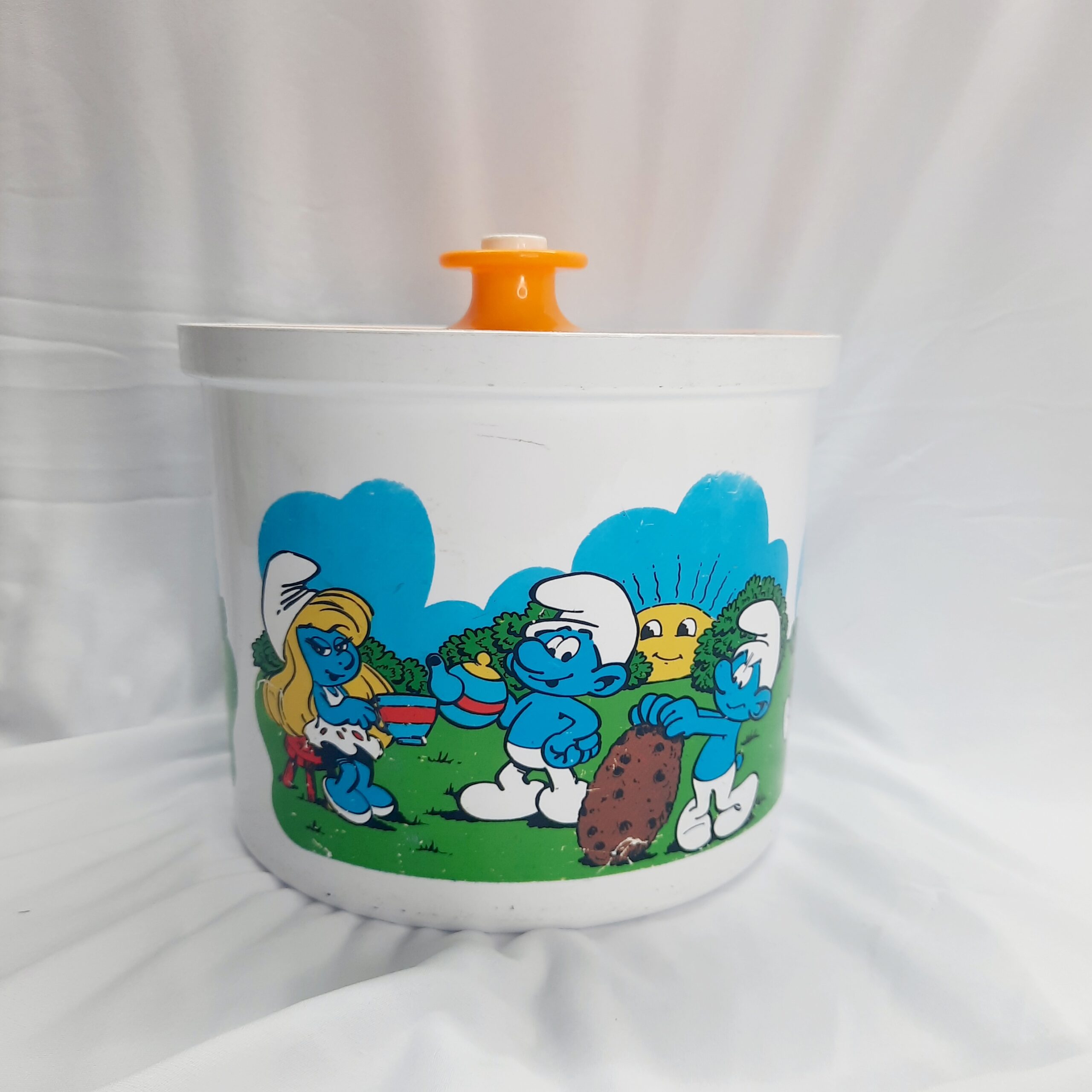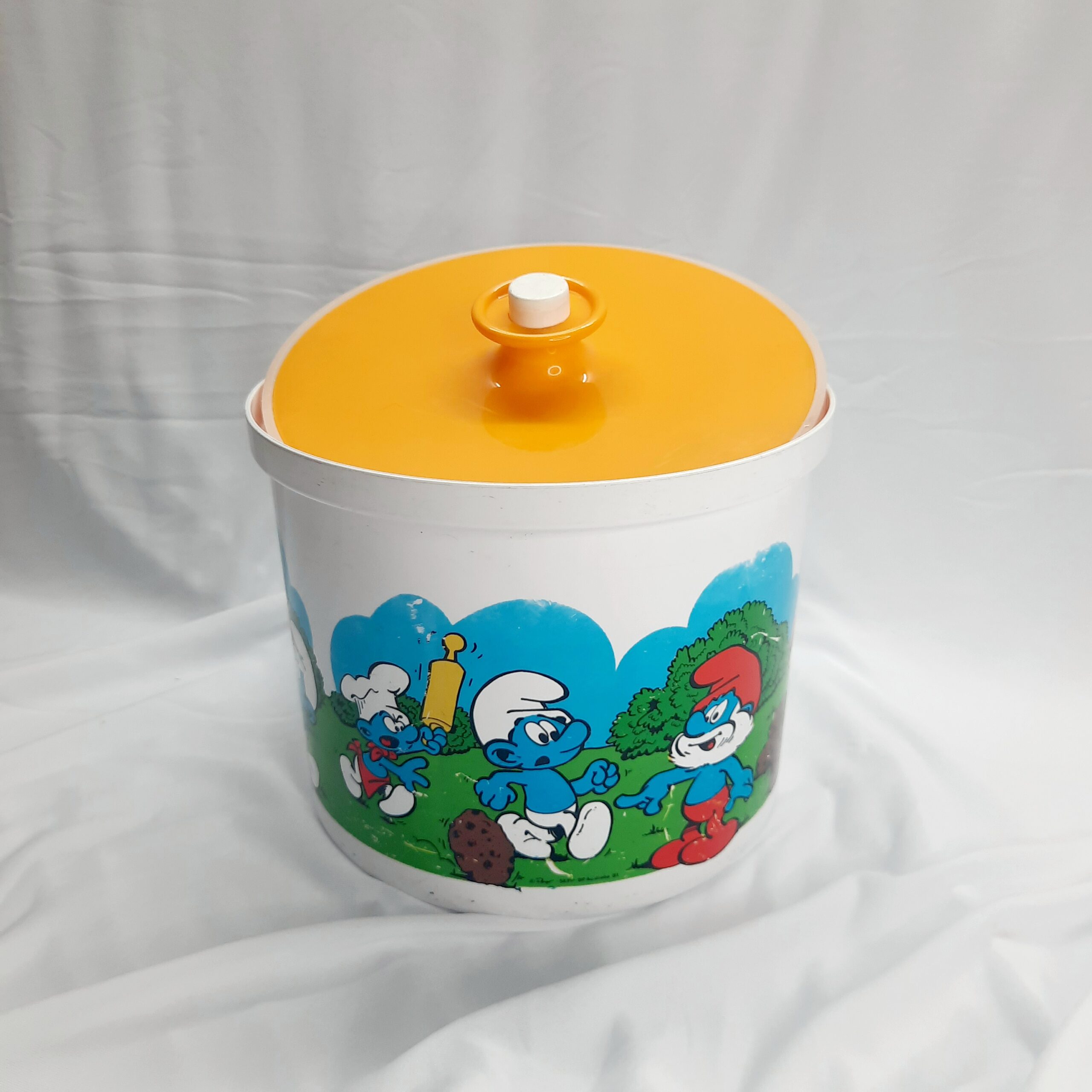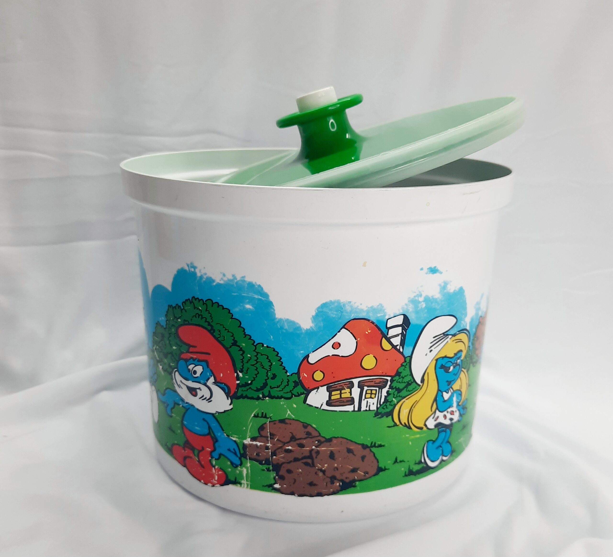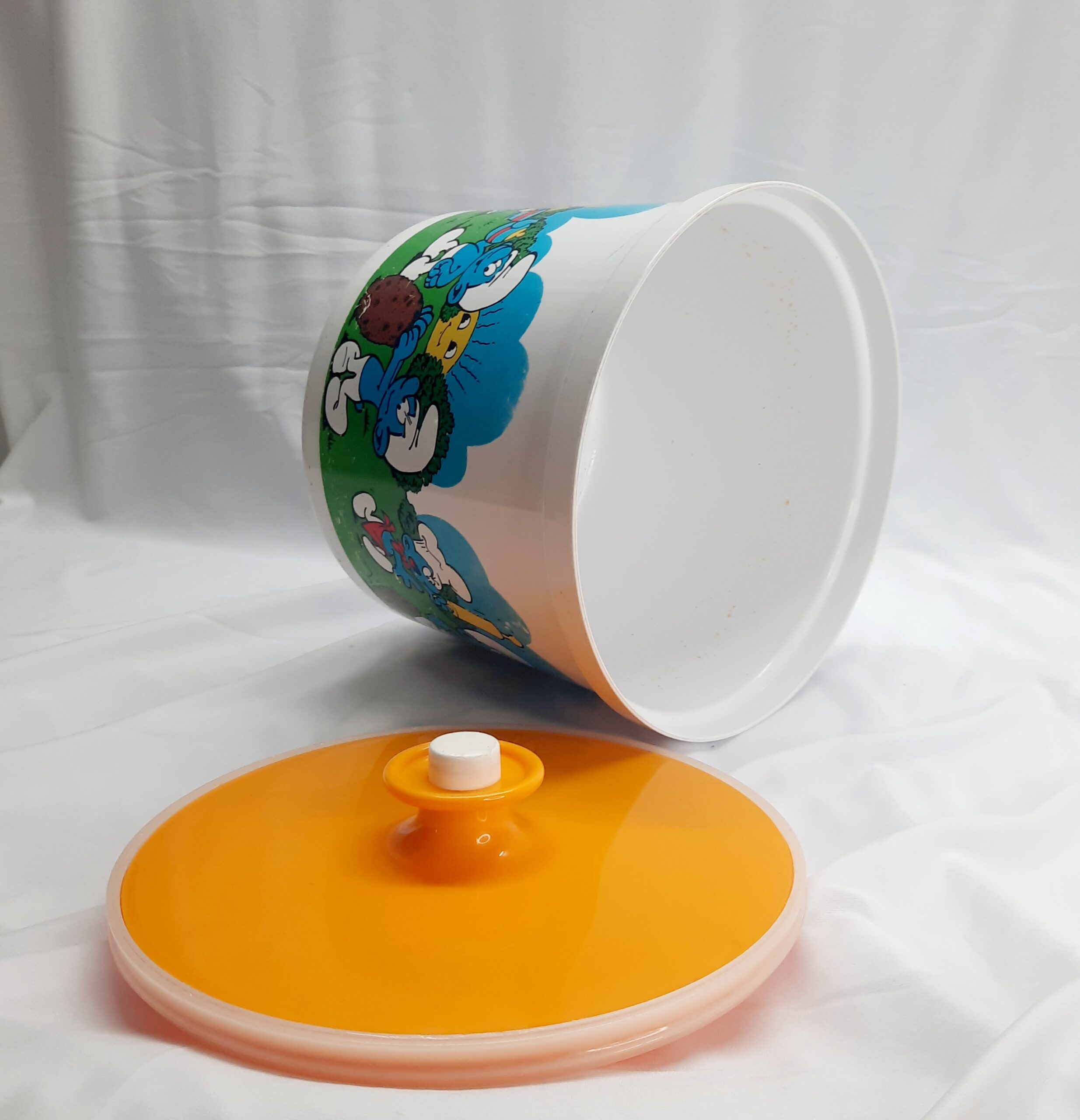 Vintage Decor 1981 Smurf canisters with green, gold-yellow and red lids. What a blast from the past with these awesome Decor canisters with the ever lovable Smurfs in their village. These canisters were released as a joint venture with BP petrol in 1981 and were limited edition. The canisters hold 3 litres or 6.3 pints with a push button sealed lid. A kids classic cartoon that will last for generations for any retro kitchen or decor. Versatile canisters for any purpose or collection. The canisters are free from any damage or cracks, does have signs of wear and tear which is to be expected for 42 years. Decor is Australian made. Make these yours today as they will not be on the shelf for too long. Packed with care for shipping.