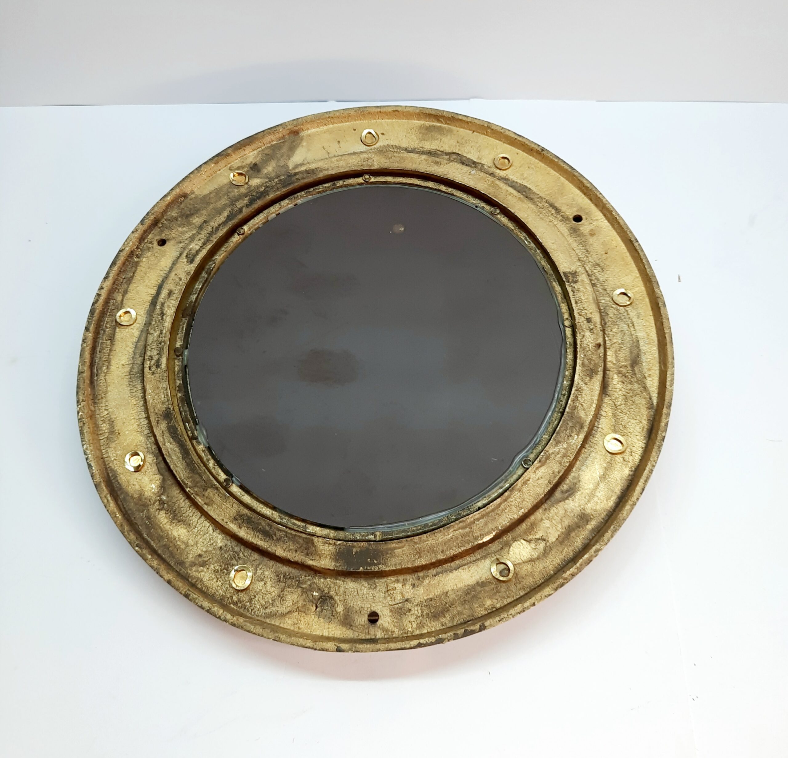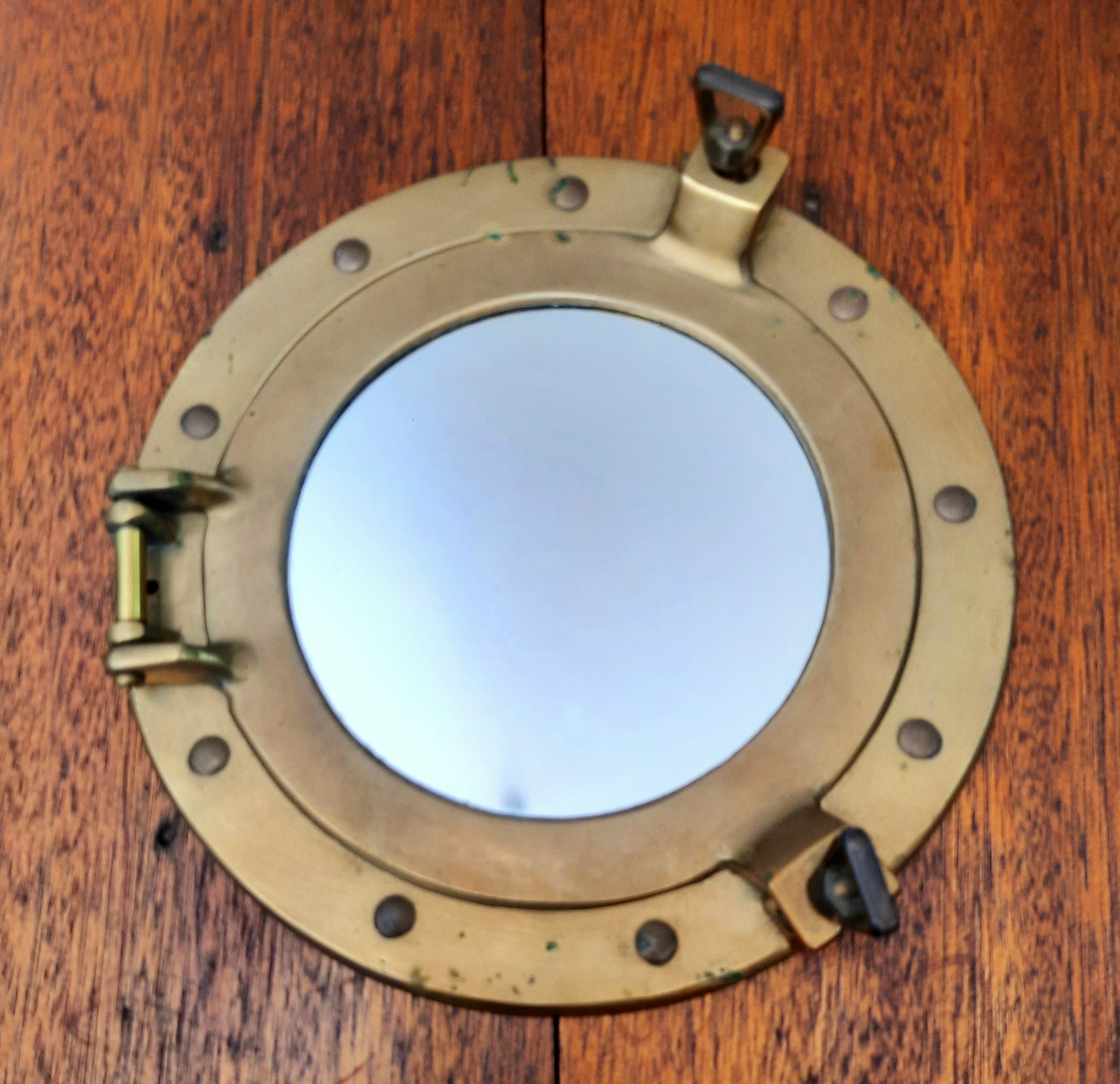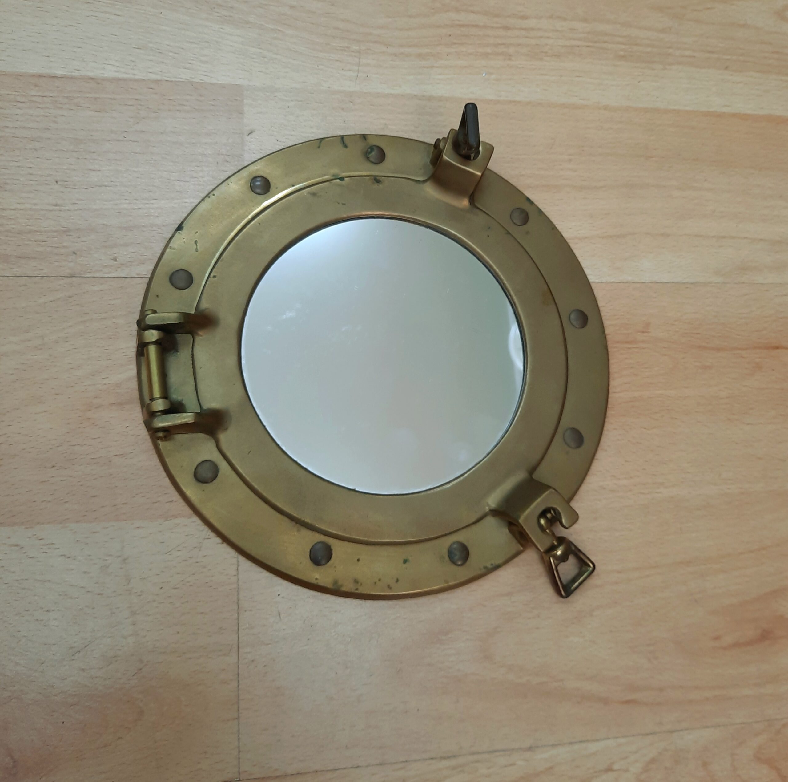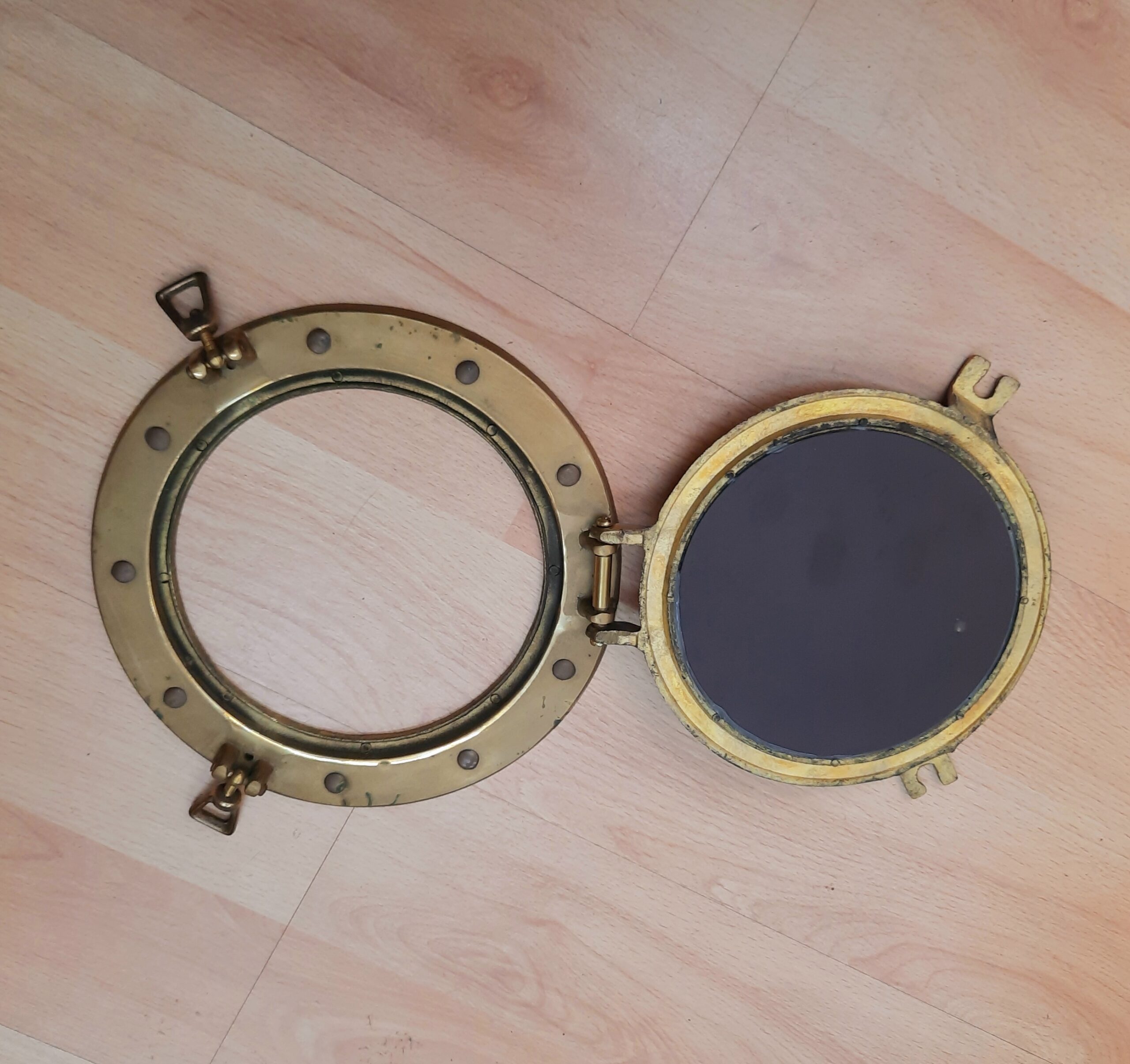 Unique vintage brass porthole mirror, 20cm diameter frame with mirror 12cm diameter. Working hinge. The frame does have some patina and a few marks which are not deep, however it adds character to the mirror and frame. Small holes to add hanging wire. Great mirror for any mancave, or bathroom that would suit the décor. Packed with care for shipping.